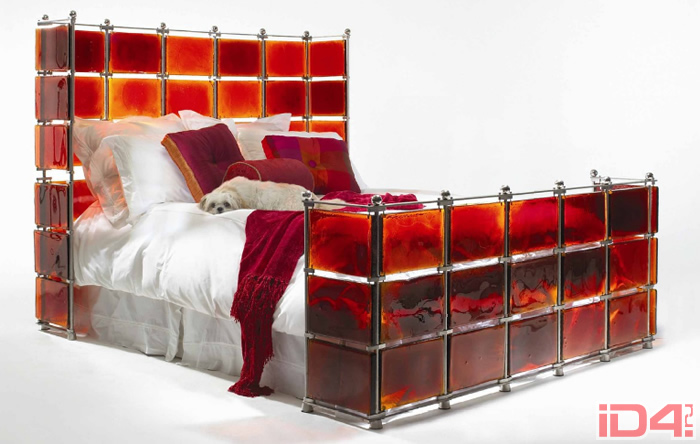 Эти кровати делаются вручную из цветного витражного стекла и полированной нержавеющей стали. Можно заказать один из двух размеров (шириной 173 или 196 сантиметров) с разным количеством рядов стёкол в изголовье — от трёх до шести (как на фотографии). Цветовая гамма тоже впечатляет — 13 разных оттенков стекла. http://www.id4.ru/opulent_items_glass_bed/#more-4140