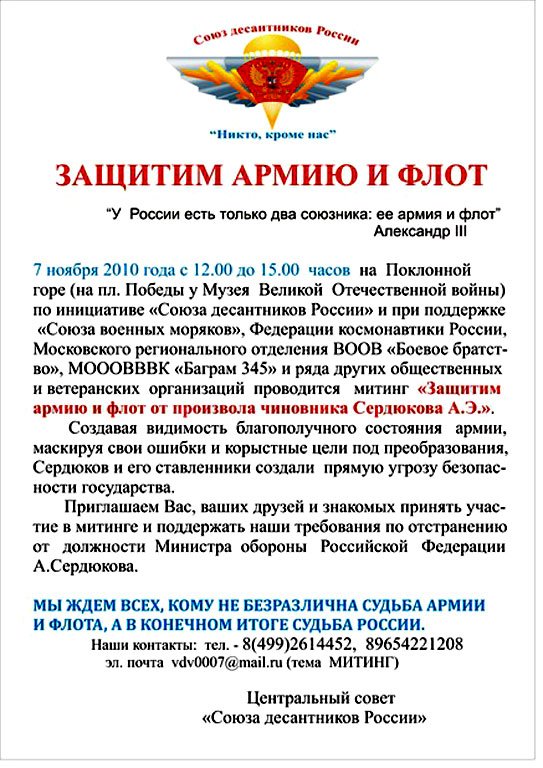 ТРЕВОЖНЫЙ СИГНАЛ ВОЕННЫЙ ПЕРЕВОРОТ? КРЕМЛЬ В ПАНИКЕ Кремль в панике. Реальные "хозяева России" начали паковать чемоданы и выводить остатки капиталов за границу. Многие уже уехали ( link ). Тем временем, информация о серьезных телодвижениях в верхах просочилась в блоги, точнее говоря не просто в блоги, а именно в так называемую "кремлевскую бригаду", которая тоже не знает, что ей делать и, похоже, теперь действует на своё собственное усмотрение, публикуя взаимно противоположные вещи. Одни говорят, что "переворот" (освобождение России) будет, другие, что нет, третьи, что "за всем стоят американцы" (ага, можно подумать, что это не Путин с Менделем разваливали страну и выводили стабфонд за бугор, а дядя Петя...). Чудинов Андрей пишет ( link ): "Военный переворот в России будет в начале ноября, скорее всего 7 ноября. Предупреждаю: это не стёб и не фэйк, доказательства ниже. В мэрию уже подана заявка на проведение военного переворота. Заявка подана 25 октября в мэрию, на 10 000 десантников. Сбор колонны назначен на Поклонной горе. Примерное время переворота - начало ноября, точную дату, руководитель переворота - глава Союза десантников России, экс-командующий ВДВ СССР генерал Владислав Ачалов озвучит чуть позже, когда она будет окончательно согласована в мэрии. Сомнений в том, что разрешение на переворот будет получено у Ачалова нет даже в малой степени. Кроме этого он заявил, что к перевороту собираются примкнуть казаки и ряд общественных организаций и деятелей, которых он раскрыть отказался. Ультиматум путчистов такой: Мы не хотим крови, пусть все руководство министерства обороны во главе с Сердюковым покинет служебные кабинеты навсегда. http://rus.delfi.ee |