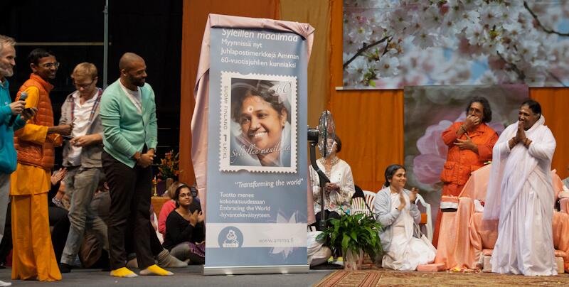 ![]() Это депутат финского парламента поздравляет Амму с шестидесятилетием! Он представил финнскую почтовую марку к шестидесятилетию Аммы. |